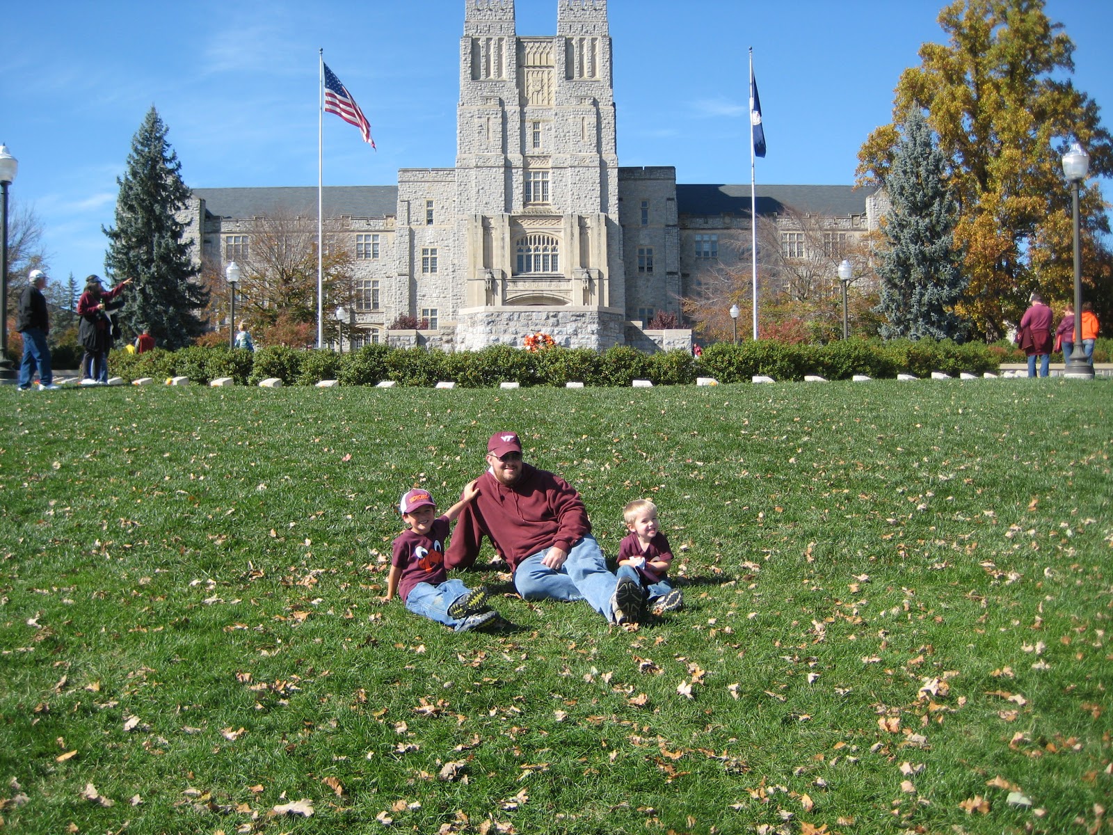 The boys and Daniel posing in front of Burrus Hall and the memorial site.